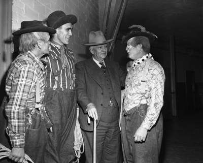 Colonel Zack Miller, left, head of the famed 101 Ranch, stops for a word with Rodeo Clown John Lindsey, right during the rodeo matinee of the Southwestern Exposition and Fat Stock Show. Lindsey recalled that he worked for Miller in 1926.