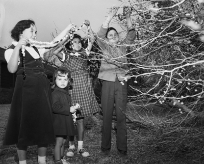 Decorating a tree for the birds in the Garden Center are, left to right, Eloise Morrow, Annette Austin, Janie Cruz and Tommy Summers. Published in Fort Worth Star-Telegram evening edition, December 18, 1950.
