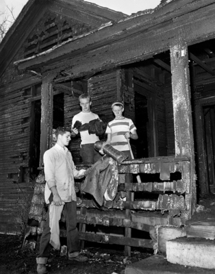 These residents of Lena Pope boy's dormitory, which burned, display some of the few personal possessions which were not ruined. They are, left to right, Bobby Murray, Eddie East and Roy Allsup. Published in Fort Worth Star-Telegram morning edition, December 18, 1950.