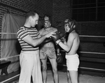 Boxing instructor Robert Smith, left of the Fort Worth Boys' Club offers advice for Alvin Gilley, 1207 N. Commerce, as Dyrell Collins, 2506 Ponsetta, looks on. The boys are FWBC team entries in the regional Golden Gloves tournament. Published in the Fort Worth Star-Telegram evening edition, December 19, 1950.