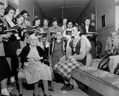 Five members of a choral group from Our Lady of Victory Academy sang carols to residents of Tarrant County Home for the Aged. Singing are (left to right) Mary Nell O'Connell, Mary Jo Mackey, Mary Campbell, Barbara Anglen and Esther Vargas. Listening are Alice Hays, Alice Moore and Kate Carter, residents of the home. Published in Fort Worth Star-Telegram morning edition, December 19, 1950.