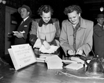 Obeying the post office request to sort the Fort Worth and out-of-town Christmas cards and tie in separate bundles are Mrs.. Ben Shirley, 2424 McLemore, and Mrs.. O. E. Phelps, 3500 Galvez. Published in Fort Worth Star-Telegram evening edition, December 19, 1950.