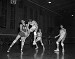 Image shows practice game between Hillsboro and Tech. Pete Walker (58) Hillsboro and Tech's Don Sifford leave the floor for control of the ball in practice game. Tech won, 53-18. Three unidentified players (7,50,3) , right.