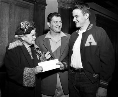 Mrs.. Lena Pope, left, and Ki Aldrich, center, manager of the Lena Pope Home, are shown with Don Ellis, Arlington Heights High School student body president, as Ellis presented $175.20 donated by students. Published in Fort Worth Star-Telegram evening edition, December 19, 1950.