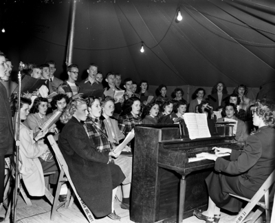 One of three choral groups presented at the Star-Telegram community Christmas tree in Burk Burnett Park, the Carter Riverside High School chorus here sings one of a group carols, with Miss Edith Winston, director, at the piano. Published in Fort Worth Star-Telegram evening edition, December 20, 1950.