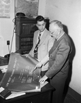 J. M. Nuessle, left, executive director of the housing authority, shows Chamber of Commerce Manager Rip Galloway plans and specifications for a $433,521 housing project. Published in Fort Worth Star-Telegram morning edition December 24, 1950.