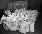 E. L. Goodman of 1641 W. Oleander checks the tag on one of the Goodfellow packages in "Pile 24." The bundles, chucked with toys, candy, nuts, fruit, and clothing, are destined for families on the North Side. Goodman is spending his 15th consecutive tour of duty with the crew preparing and routing the packages. Published in Fort Worth Star-Telegram morning edition, December 21, 1950.