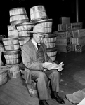 E. L. Goodman of 1641 W. Oleander, who served his 15th straight year with the Goodfellow forces, checked over the supplies at Pioneer Palace. Behind him are shown a few of the baskets of fruit which were distributed. Published in Fort Worth Star-Telegram evening edition, December 21, 1950.