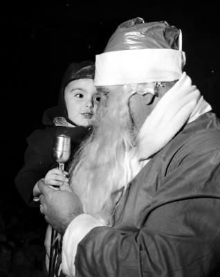 Billy Frank Hart, 3, son of Mr. and Mrs.. V. T. Hart of Arlington, tells Santa Claus what he would like in his Christmas stocking at the annual Arlington Christmas party at the mineral well. Published in Fort Worth Star-Telegram morning edition, December 21, 1950.