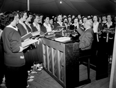 Carols and other seasonal songs were sung by Our Lady of Victory High School Chorus at the Star-Telegram community Christmas tree and music festival in Burk Burnett Park. The group was directed by W. J. Marsh, at piano, who later played a group of numbers on the Hammond organ. Published in Fort Worth Star-Telegram evening edition, December 21, 1950.