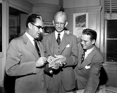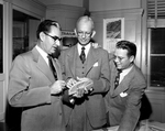 Ira Kersnick, left, ticket sales chairman for the 22nd annual Salesmen's Banquet at Hotel Texas, checks with Felix Hargis, center, and Buryl Wilson, right, on ticket needs. Hargis, distinguished service award chairman, holds the 1950 model of the award pin. Wilson is president of the Fort Worth Sales executives Club. Published in Fort Worth Star-Telegram morning edition, December 22, 1950.