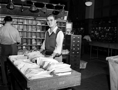 John Allen Reeves, son of Cats' president, handles overloaded mail cart before it is sorted for boxes. Published in Fort Worth Star-Telegram evening edition, December 23, 1950.