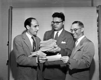 President H. G. Starkey, left, of Convair Recreation Association, gives a check to Bob Hoyt, right, and Loyd Turner delivers 4,000 Golden Gloves tickets for tournament. Hoyt and Turner were members of the GG Club supporting the tournament. The CRA, an employee organization, used tickets for "Convair Night" at fights. Published in Fort Worth Star-Telegram evening edition, December 26, 1950.
