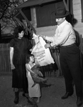 Goodfellows keep their pledge with the less fortunate as H. V. Hawthorne delivers sacks of Christmas cheer. He is an employee of Texas Electric Service Company and is typical of the scores of volunteers who helped deliver the Goodfellow packages. Hawthorne is seen handing over a bag reading "Harina para panaderos" which translates to "flour for bakers" from Spanish. The young girl is seen looking up at the bag while holding a puppy. Published in Fort Worth Star-Telegram morning edition December 24, 1951