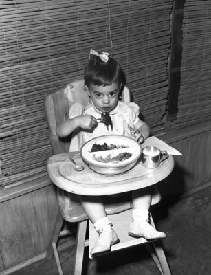 Image of Niki Holmes, shown in her highchair eating vegetables, is the daughter of Mr. and Mrs. Jack T Holmes. Published in Fort Worth Star-Telegram morning edition December 31, 1950.