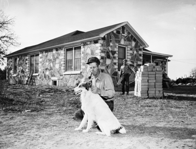 Image from a series on the J. B. Palmore Farm in Erath county, published in the Fort Worth Star-Telegram's Ranch and Farm News. J. B. Palmore is shown petting his dog, Shep, in front of the new home that he built. His son, Charles, is visible in the background. Published in March, 1951.