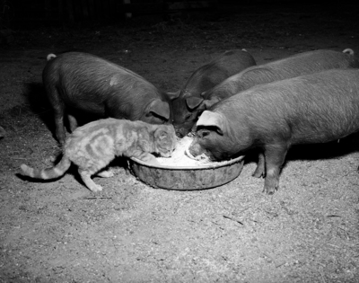 Image from a series on the Clifton Texas, Future Farmers of America, published in the Fort Worth Star-Telegram's Ranch and Farm News. The Image shows several pigs and a cat eating. Published in the morning edition, January 21, 1951.
