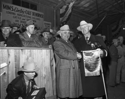 Edward F. Fisher of Detroit, left, president of the American Hereford Association, congratulates Walton W. Thorp of Britton, S. D., on showing the champion Hereford bull at the Southwestern Exposition and Fat Stock Show for the third year in a row. Thorp holds his trophy and the champion banner.
