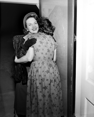 Here it is shown Margaret Phelan being greeted by her mother Mrs.. Art Phelan. They hug each other at an entrance. Published in Fort Worth Star-Telegram morning edition, December 23, 1950.