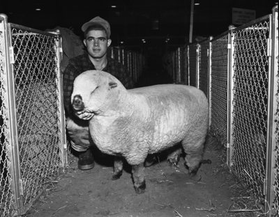 This Shropshire ewe, Oklahoma A&M College's entry in the four to six-tooth class, is held by Bennie Doane, Oklahoma A&M student, after being judged champion ewe of its breed at the Southwestern Exposition and Fat Stock Show.