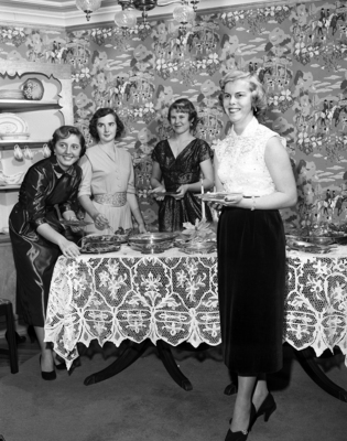 Honorees at an open house given during the holidays by their mothers, at the home of Mr. and Mrs. Hendricks Brown, 409 North Bailey, were left to right, Misses Carol Wayman, Mary Lou Brown, Gayle Brewster and Pat Wiley. Misses Wayman, Brewster and Wiley have resumed their studies at William Woods in Missouri, and Miss Brown at Rice Institute. Published in Fort Worth Star-Telegram evening edition January 5, 1951.