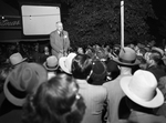 Amon Carter speaks into a microphone while a crowd of people look on.