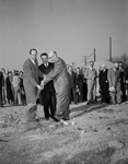 Shown breaking ground for Poly Methodist Church's new building at collard and E. Rosedale are, left to right, Doctor Law Stone, president of Texas Wesleyan College and a member of the church's stewards; Reverend Hayden Edwards, pastor; and W. A. Meacham, chairman of the trustees. Published in Fort Worth Star-Telegram morning edition December 25, 1950.