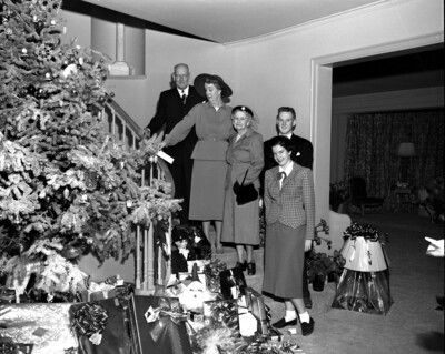 Series not published on "Christmas Day" at the Amon Carter home. A family is taking a photo on the stairs of the home. Seen to the right is a Christmas tree with mutiple presents underneath.