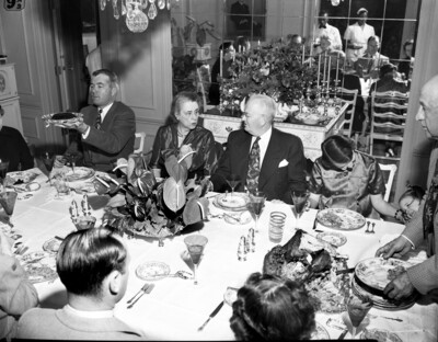Series not published on "Christmas Day" at the Amon Carter home. In the photo the family of the holiday are seen all together eating. Amon Carter is seen to the right cut off. His son Amon Carter Jr. is seen in the reflection off the wall
