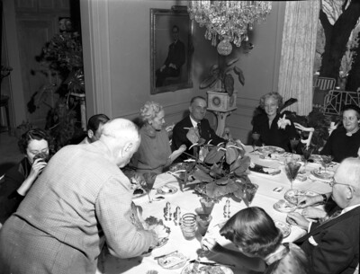 Series not published on "Christmas Day" at the Amon Carter home. Amon Carter is seen hunched over at the head of the table. His wife is seen at the other end of the table smilling at the camera.