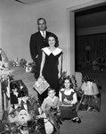 Series not published on "Christmas Day" at the Amon Carter home. Man and a woman are seen with two kids at their feet. Multiple presents are seen all along the stairs and the floor.