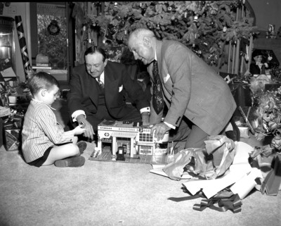 Series not published on "Christmas Day" at the Amon Carter home. Amon Carter is seated near the tree with another man. They both are playing with a little boy and his new toy.
