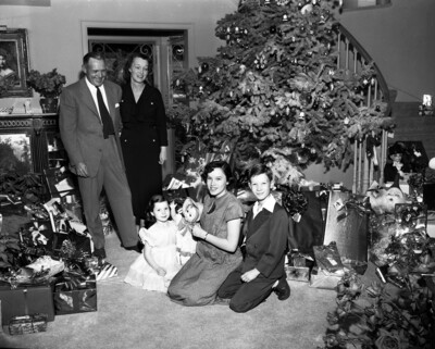 Series not published on "Christmas Day" at the Amon Carter home. Three kids are sitting at the bottom of the tree. The oldest girl is holding a toy doll. Two adults are overviewing the kids to the left of the picture.