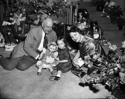 Series not published on "Christmas Day" at the Amon Carter home. Amon Carter is sitting with a woman and they are playing with the young girl and her new doll.