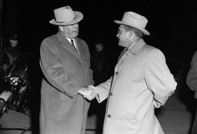 Pictured here is Howard Grubbs, right, Southwest Conference executive secretary greeting Tennessee coach, Brigadier General Robert Neyland, at Dallas' Love Field.