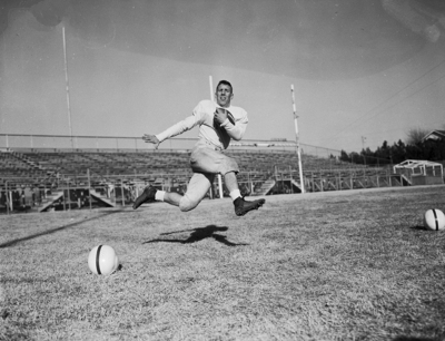 Posed action image of James Self, Wichita Falls' 145-pound wingback, has scored three touchdowns on long runs in the Coyotes' last two playoff games. He covered distances of 67, 66, and 61 yards. He'll scamper against Austin in the Class AA state finals at Dal-Hi Stadium. Published in Fort Worth Star-Telegram morning edition December 30, 1950.