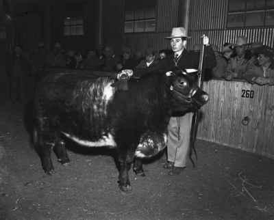 Champion Shorthorn steer of the Southwestern Exposition and Fat Stock Show was exhibited by Oklahoma A&M College and is held here by Orville Dewall, college herdsman.