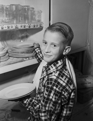 Image of James Brooks Master, who was the first baby born in Fort Worth in 1941, has learned to be a big help to his mother. drying dishes is one of the many household tasks he cheerfully performs. Published in Fort Worth Star-Telegram morning edition January 1, 1951.