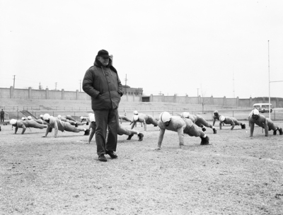 Pictured here is Gen. Robert R. Neyland, University of Tennessee head football coach, leading the warm up for workout in preparation for the Cotton Bowl against Texas.