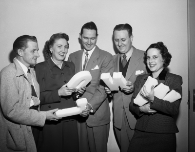 Planning decorations for the Young Men's Club formal which will be held in the Crystal Ballroom of the Hotel Texas are members of the decorations committee, left to right, John James, Mrs. James W. Short, Felix Ankele, Harry Ward and Mrs. William H. Harris. Ray McKinley's orchestra will play for dancing from 9 p. m. to 1 a. m. Published in Fort Worth Star-Telegram evening edition December 29, 1950.