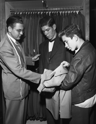 Clerk George L. Schneider, left, fits a dark sport coat on William Amyett, 19, as Jimmie Prine, 14, waits his turn. the boys were among 16 from Lena Pope Home who were given coats by John L. Ashe to replace clothing lost in a dormitory fire December 16th. Published in Fort Worth Star-Telegram morning edition December 28, 1950.