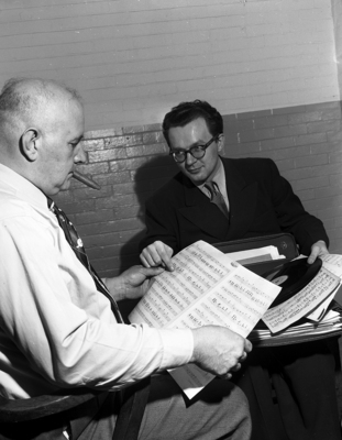 Two months in county jail under a theft charge has not dimmed the creative fires of Victor King, Chicago composer and arranger, here looking over one of his own arrangements with Jailer A. L. Freeman.