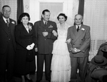 Major General Roger M. Ramey and Mrs. Latane Ramey are shown with their parents after their wedding in Shelbyville, the bride's home town. Left to right, Mr. and Mrs. M. L. Ramey of Denton, the general and his lady and the bride's father, T. P. Worsham, of Shelbyville. The bride was Miss Latane Worsham, until recently a Fort Worth resident for eight years. General Ramey, formerly stationed at Carswell Air Base here as commander of the 8th air Force, now is director of operations for the United States Air Force in Washington, where the couple will make their home. Published in Fort Worth Star-Telegram evening edition December 28, 1950.