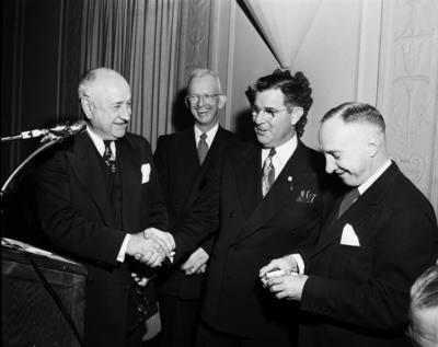 Salesmen Banquet. Amon Carter is seen shaking hands with Homer Wallace. To the right of Carter is Felix Hargis. Far right is Web Maddox, banquet chairman.