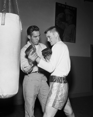 Joe Taylor, novice lightweight from Handley, gets a tip from his coach, Bobby Young, as he worked for the Fort Worth regional Golden Gloves. Young was working with several Handely boxers. Published in the Fort Worth Star-Telegram morning edition, January 4, 1951.