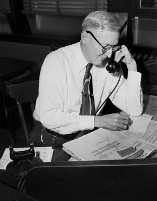 Image of Edd Terrell, at his desk, while he is on the phone. "49 years, six months on job end." Published in Fort Worth Star-Telegram evening December 29, 1950.