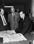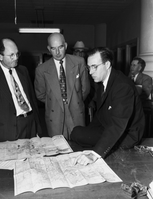 Ways which the new census tract maps can be used in varied studies are explained by Professor Robert. H. Talbert, right, of Texas Christian University to A. R. McConnell left, city zoning secretary, and Russell R. Rine, executive secretary to the Council of Social Agencies. Published in Fort Worth Star-Telegram morning December 29, 1950.