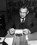 Image of Librarian Joseph S. Ibbotson is shown thumbing through the card index of volumes and collections of books given the Fort Worth Public Library as memorials. Published in Fort Worth Star-Telegram morning edition December 31, 1950.