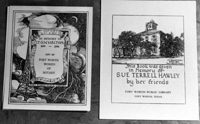 Image of very special book plates mark volumes given to the library as memorials to departed friends and relatives. Pictured are book plates of two of the largest memorial collections, those honoring Lieutenant G. W. Haltom and Mrs. Sue Terrell Hawley. Published in Fort Worth Star-Telegram morning edition December 31 1950.