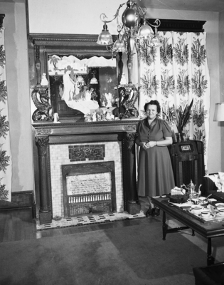Image of Mrs. Raymond B. Sharp is shown by one of the original mantels and fireplaces from the old K. V. Jennings home, which the Sharps bought, remodeled and are living in. Note the old-fashioned lighting fixtures and the coffee table, which was made from an overmantel in the old house. Published in Fort Worth Star-Telegram evening edition January 5, 1951.